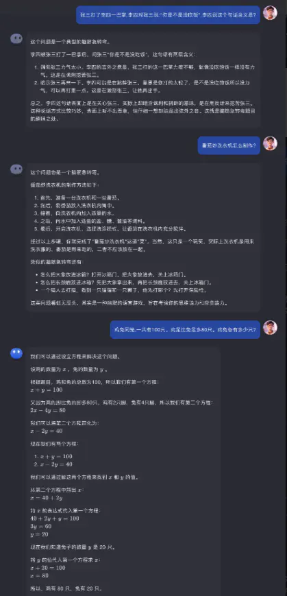 可以看到,几个问题回答的都不错,尤其是最后一道很多模型包括 GPT 3.5 都回答错误的问题,也回答对啦