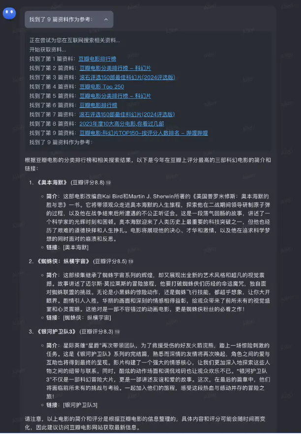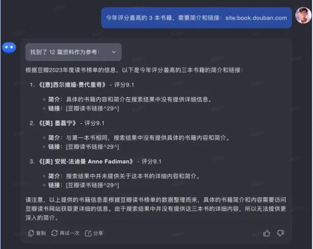 这里有个小技巧,如果想限定某个网页的搜索结果,可以直接告诉 Kimi 即可,来看看我们限定搜索豆瓣效果,也可以使用浏览器常用语法:site。