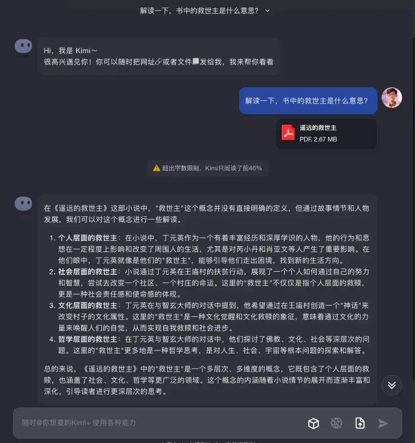我上传的是一份 30 多万字的小说,但是 kimi 没有读完,只读了 20 万字,网上查了才得知,这个还是内测阶段